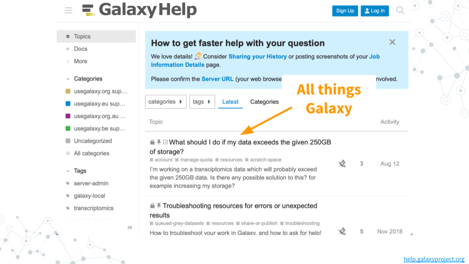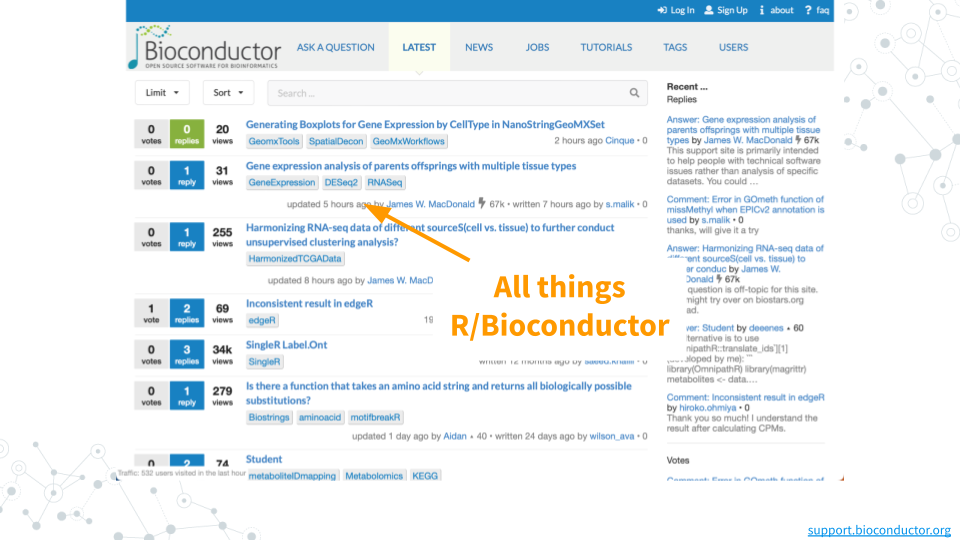 The genomic data science community is a remarkably open community that continually strives to increase opportunitites and broaden access to the scientific enterprise (e.g. GDSCN 2022). There are many opportunities to interact online with scientists that share a common research question, career stage, or even favorite tool! Below is a sampling of some discussion forums that you may find useful: