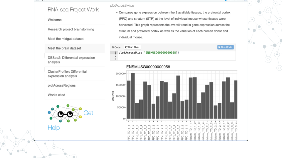Launch the “RNA-seq Project Work” tutorial to apply the skills you learned in earlier modules to calculate differential expression, explore genetic pathways, and plot across conditions. Be sure to use the new functions including